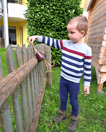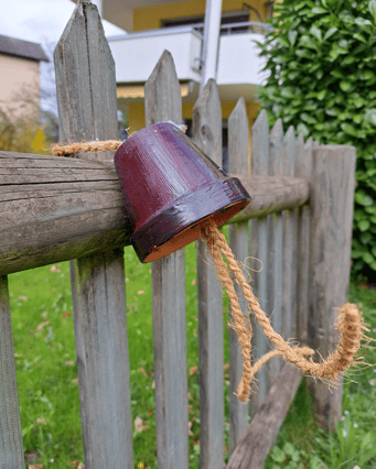 Damit die Vögel auch noch das Futter, welches wir reingefüllt haben, auch rauspicken können, haben wir sie im Garten mit einer Schnur an einem schönen Plätzchen auf gehangen.