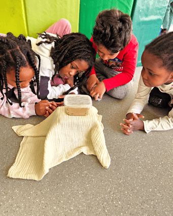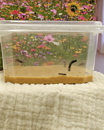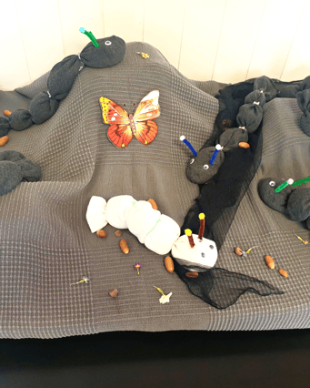 Petra stellte ein Tuch in die Mitte, wo sich etwas darunter versteckte. Ganz gespannt schauten wir darauf. Als sie das Tuch wegnahm, waren in einer kleinen Box fünf kleine Babyraupen. Petra erzählte uns das die Raupen jetzt bei uns in der Kita sind und wir sie jeden Tag beobachten dürfen wie sie sich entwickeln. Sie zeigte uns auch das Netz, wo wir dann die Raupen im Kokon rein machen können bis sie schlüpfen und dann frei lassen können.