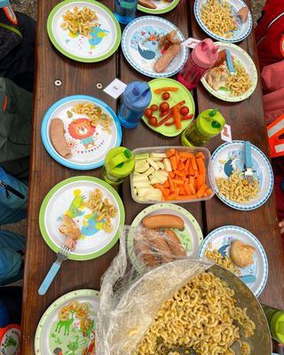 Zum Mittagessen gab es Teigwarensalat, Cervelat mit Brot und verschiedenes Rohgemüse. Einige Kinder durften den Betreuerinnen helfen die Würste zu grillen und andere den Tisch zu decken. Um 11.30 Uhr kam die zweite Gruppe nach und wir genossen unser Mittagessen. Nachdem essen durften wir etwas Ruhiges spielen, da einige Kinder Mittagsschlaf im Kinderwagen machten. Nach der Pause gingen einige Kinder und Betreuerinnen zurück in die Kita. Die anderen durften noch im Wald bleiben und viel erleben, unter anderem kletterten wir herum, machten ein Bett für die Tiere und sorgten dafür, dass das Feuer nicht erlosch.