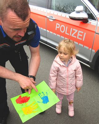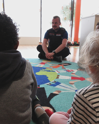 Der Polizist Herr Gut kam heute zu uns auf Besuch. Schon ganz gespannt und nervös sassen wir im Kreis und warteten auf ihn. Als wir von unserem Fenster aus ein Polizeiauto gesehen haben, waren wir sehr aufgeregt und hatten ein grosses Lachen im Gesicht.