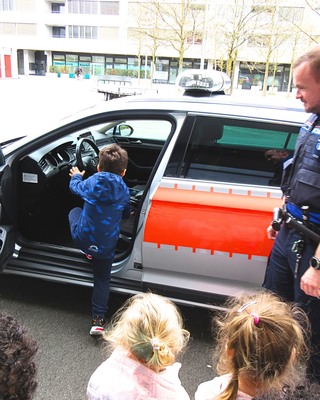 Gemeinsam sind wir dann nach draussen gegangen, wo er auch sein Polizeiauto parkiert hatte. Herr Gut öffnete alle Türen und den Kofferraum und erzählte uns, welche Gegenstände die Polizei wofür benutzt. Herr Gut nahm sogar das Triopan aus dem Kofferraum und die Verkehrshüte und zeigte sie uns.