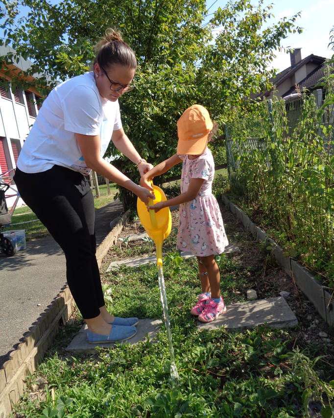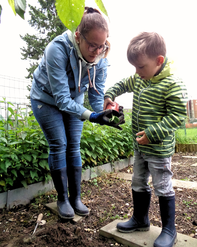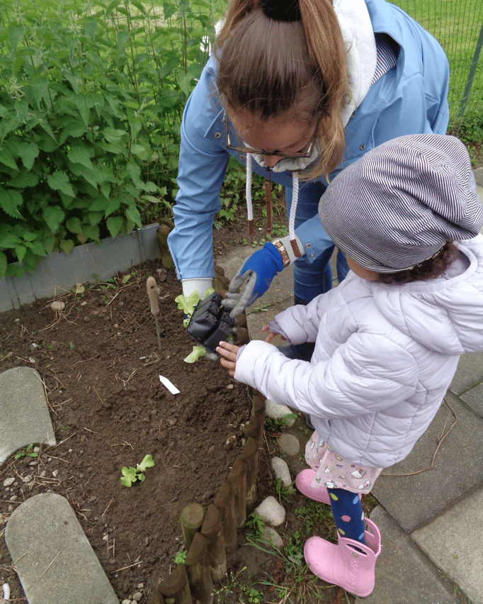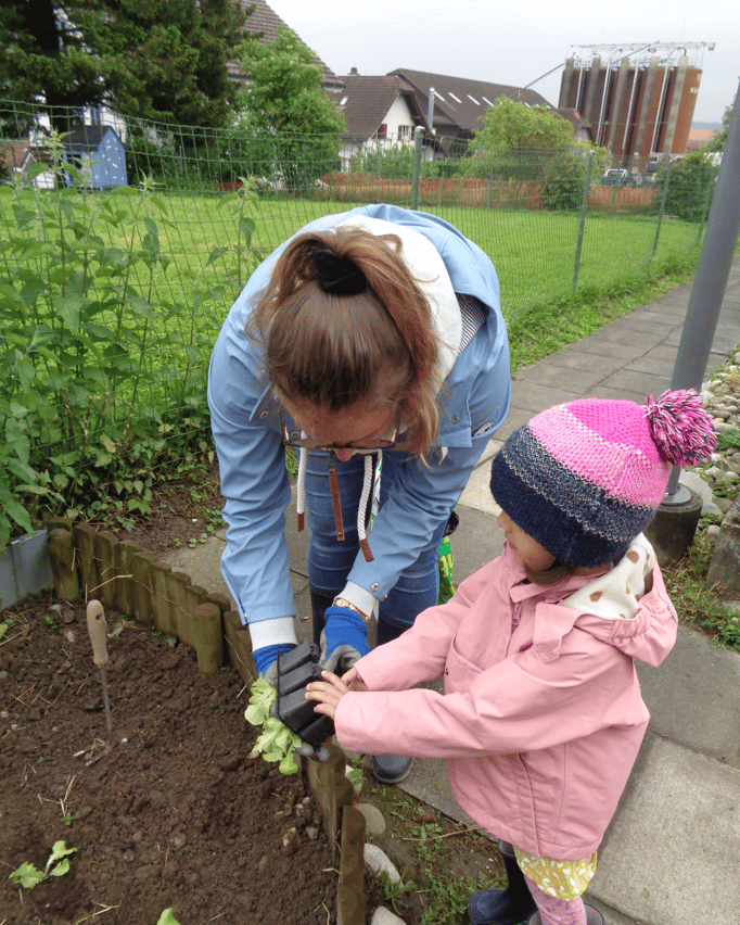 Gemeinsam mit unseren Betreuerinnen haben wir die Erde vom Unkraut befreit. Danach pflanzen wir die Setzlinge ein und begiessen sie mit viel Wasser.