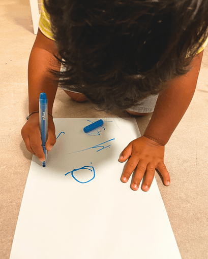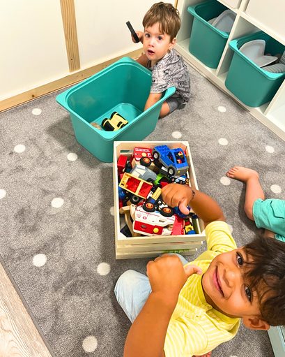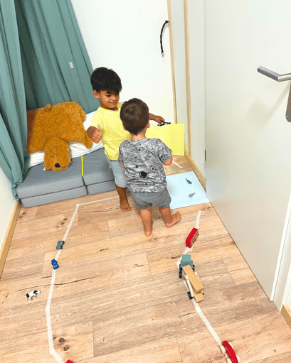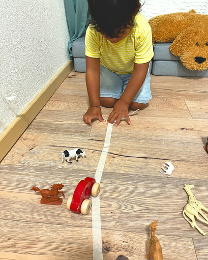 Nach dieser tollen und lustigen Geschichte hat uns unsere Betreuerin eine neue Aufgabe gestellt. Gemeinsam durften wir mit Klebeband eine Autostrasse kleben. Danach durfte ein Kind nach dem anderen erzählen, wie es seine Sommerferien verbracht hat und was es da alles erlebt hat. Dazu platzierten wir bei der Autostrasse Gegenstände, die zu unserem Urlaub passen.