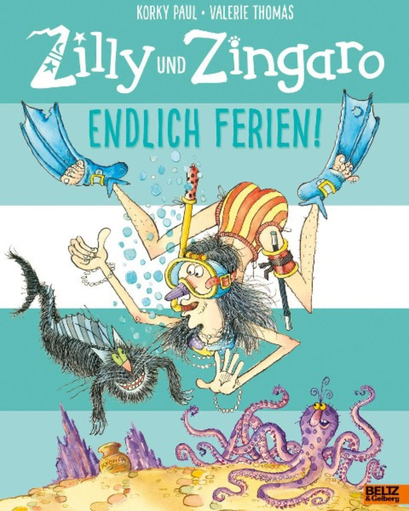 Kaum ist Zilly am Strand gelandet, streift sie auch schon die Schwimmflossen über und taucht in die Fluten. Was für eine herrliche Welt tut sich unter Wasser auf! Kater Zingaro ist natürlich wasserscheu. Da hat Zilly eine geniale Idee: Sie schwenkt den Zauberstab, und schon hat sie Zingaro in einen Fisch und sich selbst in einen Kraken verwandelt. Jetzt geht das nasse Vergnügen erst richtig los!