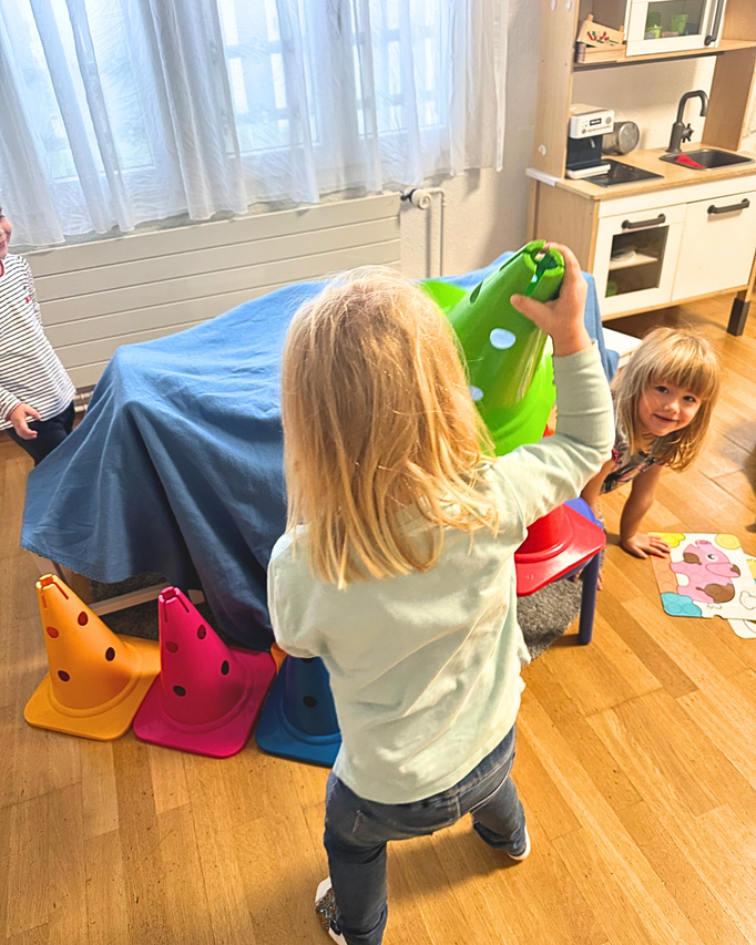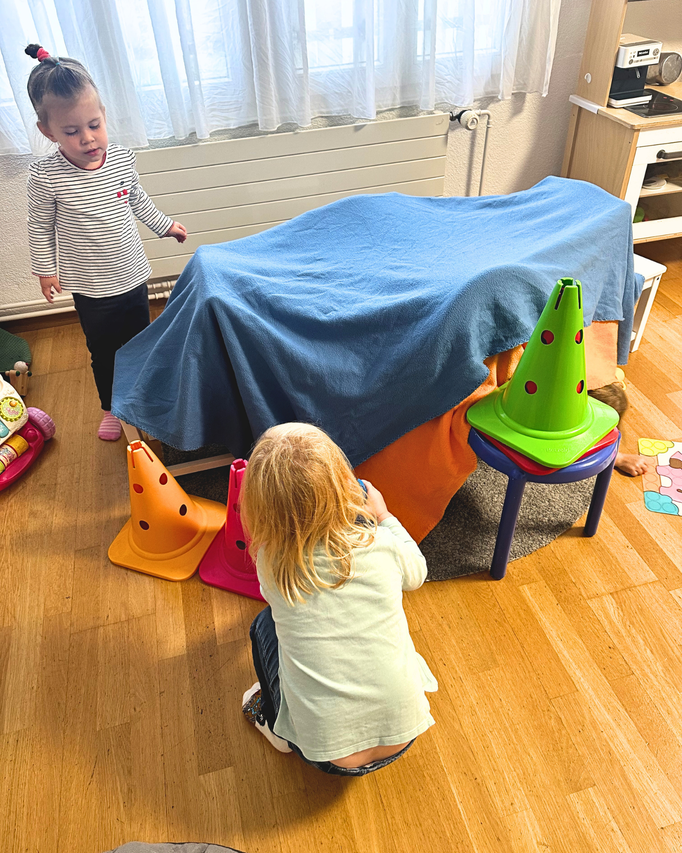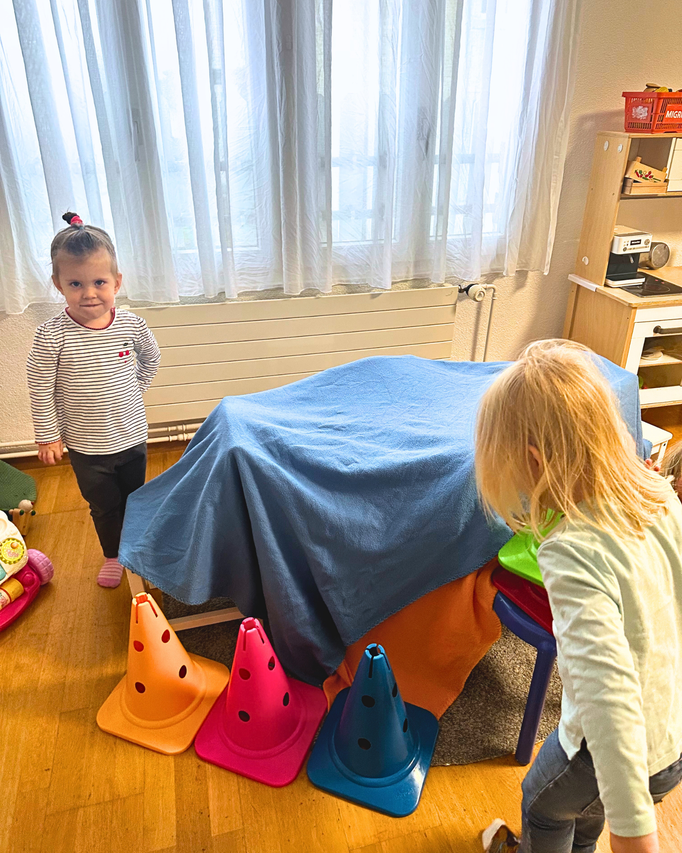 Jedes Kind durfte danach helfen, die Bärenhöhle aufzubauen. Die Höhle entstand mit Stühlen, Tücher und den farbigen Hüten, die wir manchmal als Hexen- oder Zauberhüte verwenden. Als die tolle Bärenhöhle fertig aufgebaut war, konnten wir Bären spielen, die in dieser Höhle wohnen. Jemanden spielte die Bärenmutter, Bärenvater und ein Bärenkind. Wir hatten einen riesigen Spass und möchten ein anderes Mal, wieder eine so lässige Höhle bauen. Wir konnten so lange spielen, bis wir den Mittagskreis machten.