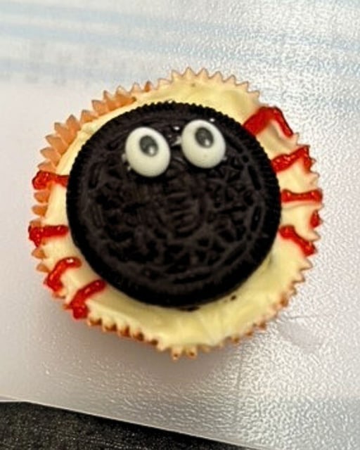 Aber das Beste war unser Essen. Die ganze Woche über haben wir Gruselspeisen gegessen und konnten auch dabei mithelfen, sie zuzubereiten. Wir haben Spinnenmuffins gebacken und jedes Kind konnte seine eigene Spinne auf dem Muffin gestalten. Dann haben wir auch noch Chili con Carne gemacht und dafür eine Peperoni in ein Gruselmonster verwandelt und mit dem Chili con Carne gefüllt. Auch Mumien durften nicht fehlen, also haben wir zusammen Wienerli-im-Teig-Mumien gemacht. Das sah alles so gefürchig aus, aber es war sooooo lecker!