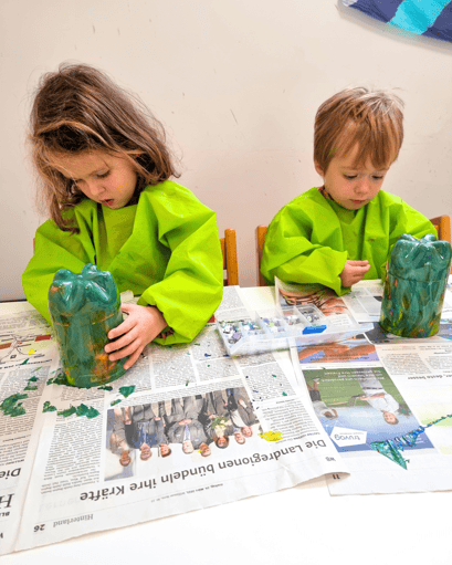 Anschliessend mussten wir warten, bis die Farbe etwas angetrocknet war, und wechselten zum Freispiel. Am Abend als es draussen schon etwas dunkler geworden war, fragte uns eine Betreuerin, ob wir unsere Laternen mit einer kleinen Led-Kerze im Dunkeln betrachten wollten. Das schien uns natürlich eine tolle Idee, welcher wir sofort nachgingen.