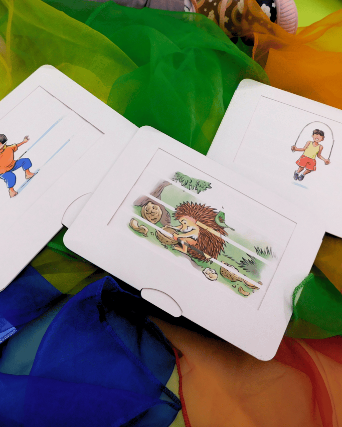 Heute durften wir mit verschiedenen Elementen Springen, Hüpfen, Drehen und Balancieren. Am Anfang hat uns die Betreuerin 3 Bilder gezeigt, welche uns die Übungen vorstellen und zeigen. Dies fanden wir sehr lustig, da wir die Bilder auf und zu machen konnten, um zu sehen wie die Bewegung genau funktioniert.