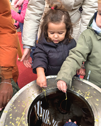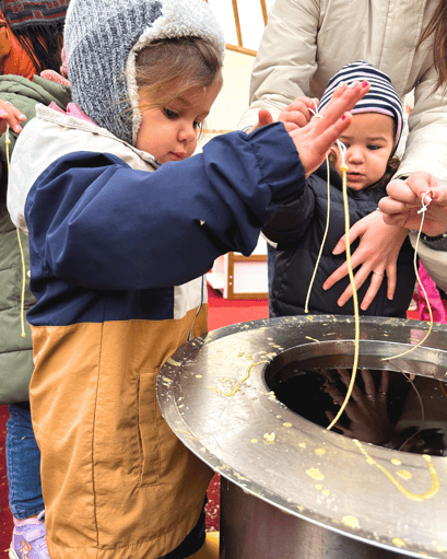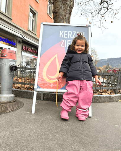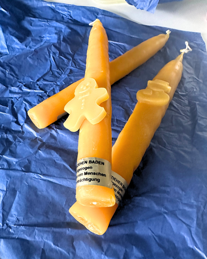 Von weitem erkannten wir ein grosses Zelt, was mag das sein? Wir werden zusammen unsere eigenen Kerzen ziehen. Wir fingen alle vor Freude an zu hüpfen. Eine Frau an dem Stand erklärte uns wie das geht, dabei hörten wir ihr gespannt zu. Anschliessend durften wir mit unseren Kerzen anfangen.