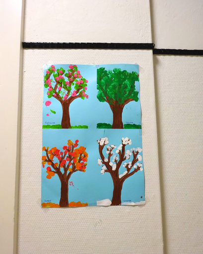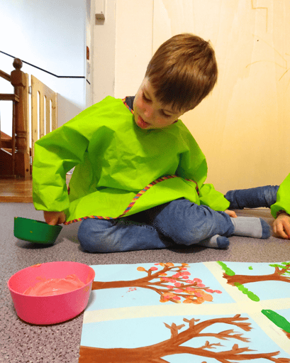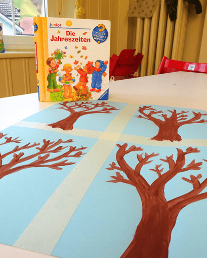 Als wir uns das Buch fertig angeschaut haben, erklärte uns Alice, dass wir nun ins Bastelzimmer gehen können. Dort hatte sie ein Blatt vorbereitet mit vier kahlen Bäumen, ohne Blätter! Wir durften dann unsere Finger in die Farben tunken, um die Blätter an den Bäumen, die Blumen oder den Schnee zu malen. Ihhh, die Farbe war ganz schön schleimig, das hat uns doch etwas Überwindung gekostet.