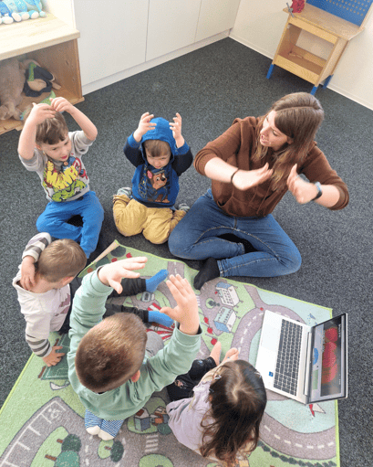Unsere Lernende haben einen Auftrag erhalten, eine Bewegungsgeschichte zu schreiben und diese mit uns durchzuführen. In dieser Geschichte lernen wir auch wieder neue Gebärden. Die Bilder dazu dürfen wir ausdrucken und in den Kitaräumlichkeiten verteilen. So, dass wir sie jeden Tag üben können. Auch lesen uns die Betreuer/innen eine Geschichte vor, welche sich um das Thema dreht. Gespannt lauschen wir der Geschichte.