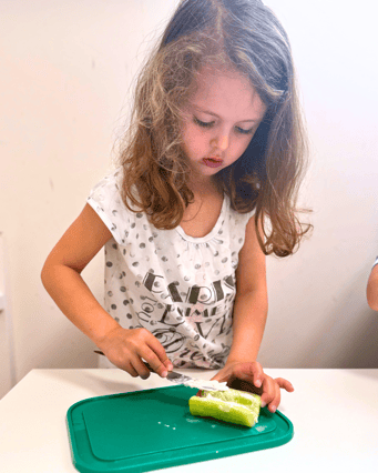 Wir waren sofort dabei und setzten uns gleich nach dem Händewaschen an den Tisch in der Küche. Sie erklärte uns, wie wir vorgehen sollten und wir fingen damit an die Gurken erstmals zu schälen und in kleinere Stücke zu schneiden und zu halbieren. Die Betreuerin hat uns dabei geholfen, denn das war gar nicht so einfach wie es aussah. Die Gurkenhälften haben wir mit einem Löffel ausgehöhlt, und danach haben wir diese mit Frischkäse wieder befüllt. Jetzt fehlten nur noch kleine Fahnen, welche wir aus einem grünen Blatt zurechtgeschnitten haben und an einem Zahnstocher befestigt haben.