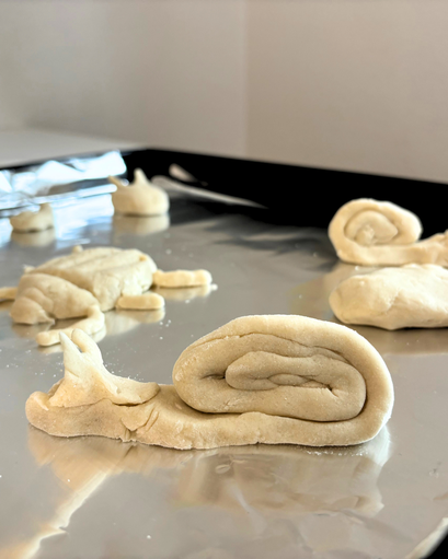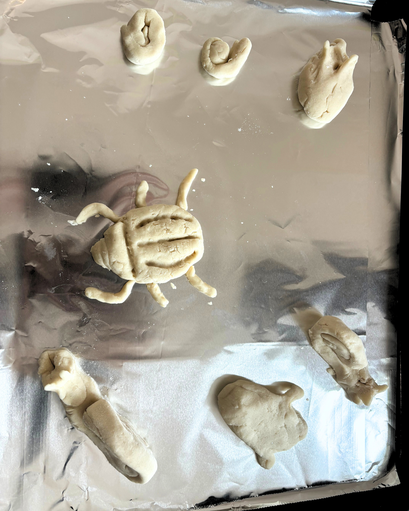 Nach dem Morgenkreis haben wir uns am Tisch gesammelt und Mac hat uns nochmals erzählt, was wir machen. Alle Utensilien, die wir für den Salzteig brauchten, waren schon auf dem Tisch bereit. Wir halfen Mac den Salzteig anzumischen und rasch war er schon fertig. Jeder und jede von uns Kindern hat ein Stück Salzteig bekommen und so versuchten wir einen Maikäfer daraus zu formen. Wir kneteten und kneteten, bis wir zufrieden waren mit unseren Ergebnissen. Danach gingen unsere geformten Maikäfer in den Ofen zum Aushärten.