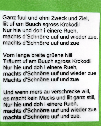 «Ganz fuul und ohni Zweck und Ziel, liit uf em Buch s gross Krokodil, nur hie und do mit einere Rueh, machts d Schnöre uf und wieder zue»