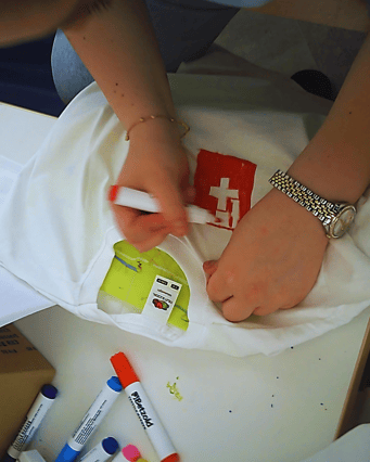 Arta zeigte uns im Morgenkreis den Tagesablauf bildlich auf. Am Nachmittag hat sie da ein T-Shirt gemalt. Warum nur? Sie erzählte uns, dass wir am Nachmittag zusammen Trikots malen werden. Das Beste daran, wir dürfen sie mit nachhause nehmen! 🏠 Den ganzen Tag waren wir gespannt. Welche Rückennummer haben wir? Am Nachmittag war es soweit. Arta und Melda riefen uns in einen Kreis. Wir durften in das Bastelzimmer gehen. Sie haben uns die T-Shirts anprobieren lassen und geschaut, welches am besten passt. Anhand einer Zahlentabelle durften wir unsere Rückenzahl aussuchen. Die Betreuer gestalteten unseren Namen und wir durften nach Lust und Laune das Shirt bemalen. 🎨