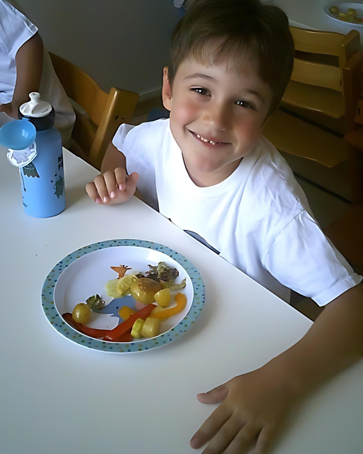 Wir haben einmal in der Woche ein Piratenessen 🏴☠️🍴, das heisst dann dürfen wir mit den Händen essen, egal was es zum Mittagessen gibt. Auf das Piratenessen freuen wir uns immer sehr 😊, da es für uns immer spannend ist, das Essen mit den Fingern zu essen ✋. Im Mittagssingkreis 🎶 verteilte Evi uns unsere Piraten-T-Shirts aus der Piratenkiste 📦🏴☠️, jeder von uns hat sein eigenes T-Shirt mit Namen 👕. Wir zogen sie alle gemeinsam an und danach rief uns Chiara zu Tisch 🪑. Als wir alle unseren Platz gefunden hatten, sagten wir gemeinsam unseren Piratenspruch auf 🏴☠️📣. Danach rief uns Chiara und sagte, was es zum Mittagessen gibt: Ofengemüse mit Kartoffeln 🥔🥦 und Cipollata 🌭 und noch einen leckeren Salat 🥗 von unserem eigenen Garten mit Gurken 🥒. Dieses Essen fanden wir sehr lecker 😋