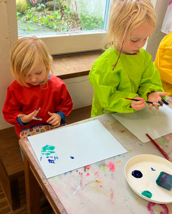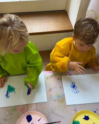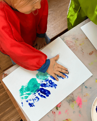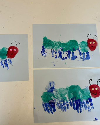 Zuerst hat jedes Kind seine Handfläche in der bestimmten Farbe angemalt 🎨 und daraufhin wurde die angemalte Handfläche auf das Papier gepresst. So entstand der erste Grundstein für den Körper der Raupe 🐛. Danach folgten 3–4 weitere Handabdrücke für den Körper, je nach Länge der Raupe ✋. Den Kindern fiel aber direkt auf, was noch fehlt: die Beine und Füsse der kleinen Raupe Nimmersatt 👣. Mit den Beinen und Füssen ging es dann auch direkt weiter. Diese wurden ebenfalls mit Fingerabdrücken gestaltet 🖐️. Hierzu malten die Kinder ihre eigenen Finger an und pressten sie auf das Papier, passend zum Körper der Raupe Nimmersatt.