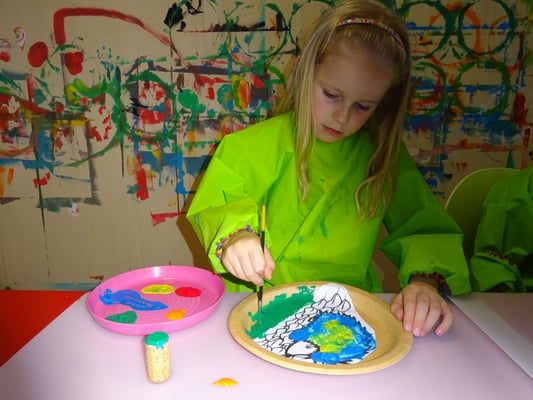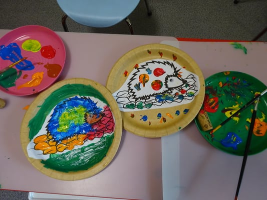 Danach durften wir in unseren Bastelraum gehen und die Igel ganz bunt, mit einem Korkzapfen als Stempel und mit einem Pinsel ausmalen. Als wir damit fertig waren, schnitten wir unsere Bilder aus