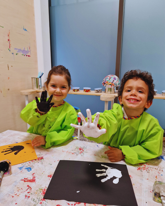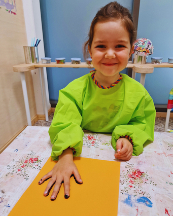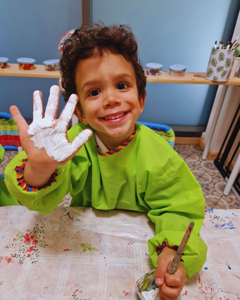 Nach dem Vorlesen hatten wir eine tolle Idee 💡: Wir wollten auch mal kreativ werden! Also haben wir unsere Hände mit weisser Farbe angemalt 🎨✋. Das war schon ein wenig klebrig, aber so viel