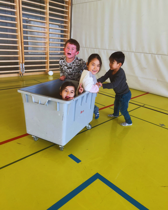 Wenn wir jeweils in der Turnhalle ankommen, ziehen wir uns um und machen in der Turnhalle einen Kreis 🔵. Wir singen Lieder 🎤🎵 zusammen und tanzen auch dazu 💃🕺. Während dem wir singen und uns aufwärmen, stellen ein paar andere Betreuer ganz viele Bewegungselemente auf: Trampoline 🤸♂️, Matten 🟦, Fussbälle ⚽ und sie lassen auch die Ringe und Affenschwänze 🐒 runter, damit wir daran schaukeln können. Natürlich darf auch die Musik 🎶 zur Bewegung nicht fehlen.