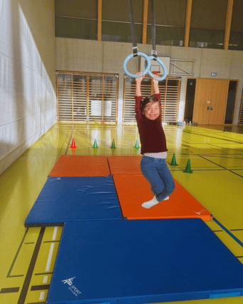 Auf den Matten üben wir jeweils unsere Kunststücke 🤸♀️. Schon ganz viele Kinder schaffen es, einen Purzelbaum zu machen 🤹♂️. Wir sind auch so mutig, dass wir jeweils mit viel Anlauf aufs Trampolin 🏃♂️➡️🤾♂️ hüpfen und danach auf einer Matte landen.