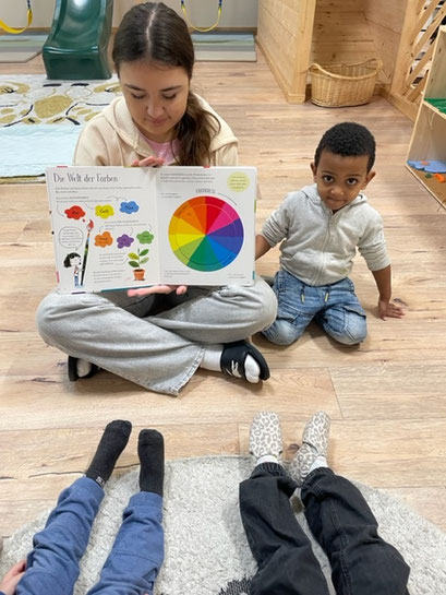 Gemeinsam haben wir unsere Bilder betrachtet und zum Schluss mit unserer Erzieherin noch geschaut, wo sich die Farben auf unseren Bildern im Farbkreis finden lassen.