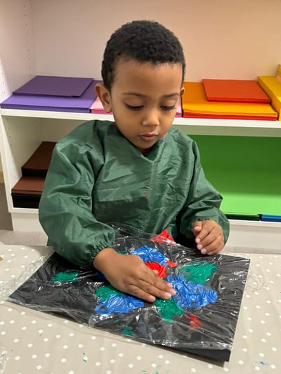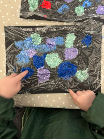 Dann kam die Frischhaltefolie darüber und wir durften die bunten Kleckse mit unseren Fingern verstreichen. Nachdem wir die Kleckse verstrichen hatten, hatte jedes von uns ein Kunterbuntes