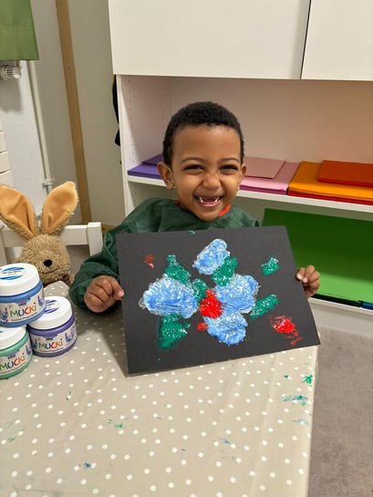 Wir haben uns riesig gefreut, dass wir unsere Hände benutzen dürfen. Zuerst durften wir uns alle Farben aussuchen, die wir gerne mögen. Danach haben bunte Kleckse auf das Blatt gemacht.
