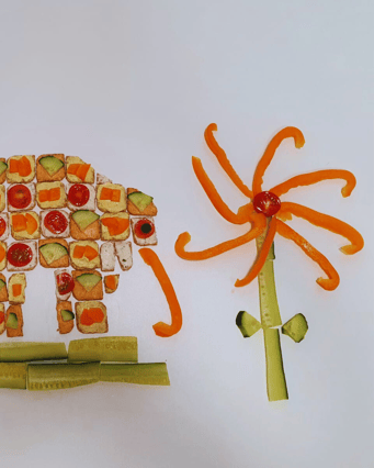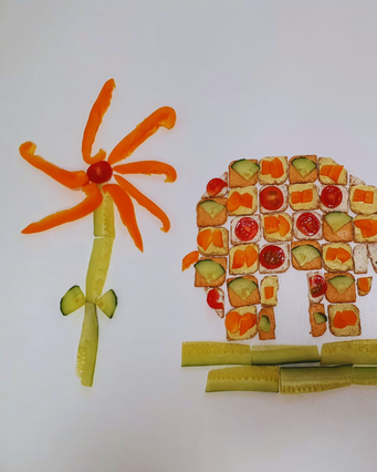 Anschliessend bereiteten wir alle zusammen das Zvieri vor 🥒🍅. Die Betreuerin erklärte uns, dass wir einen Elmar aus Darvida machen 🍪🐘. Dafür gingen wir uns die Hände waschen 🚿 und setzten uns an