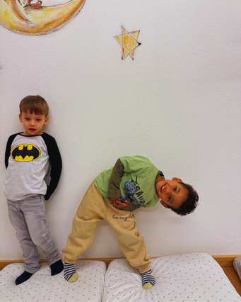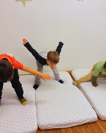 Heute durften wir mit Albina und Erjona ein Kinderyoga machen 🧘♀️🧘♂️. Als wir im Schlafzimmer ankamen, war schon alles für uns bereit 🛏️. Wir konnten entscheiden, bei welchen Matratzen es für uns am bequemsten war 🛋️. Denn es ist wichtig, dass man sich beim Yoga auch wohlfühlt 💆♀️💆♂️. Mit Erjona und Albina haben wir abgemacht, dass wir die Matratzen nach einigen Yogaübungen abwechseln werden 🔄, und damit waren alle einverstanden ✅.