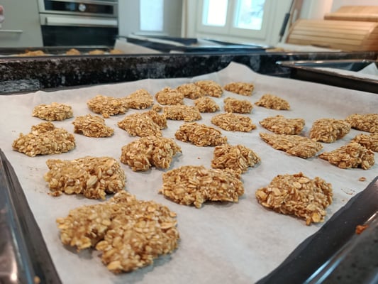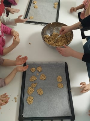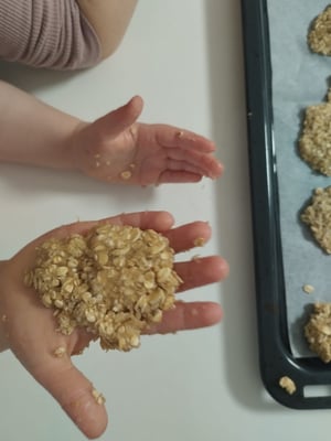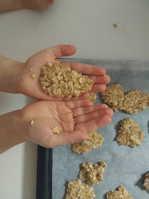 Diese Woche haben wir das Thema Fein- und Grobmotorik. Wir haben bereits ganz tolle Sachen gemacht, wie zum Beispiel den Dreipunktgriff kennengelernt. Heute hat sich unsere Betreuerin etwas ganz Besonderes ausgedacht. Durch diese Aktivität, können wir sogar unser eigenes Zvieri vorbereiten. Da wir uns vermehrt Farmer zum Zvieri wünschten, kam unsere Betreuerin auf die gute Idee, dass wir diese doch selber machen könnten. Somit machte sie sich auf die Suche nach einem Rezept und wurde sogar fündig. Laut Rezept benötigen wir nur Apfelmus und Haferflocken. Für die Farmer mussten wir nur Haferflocken und Apfelmuss in einer Schüsselzusammenmischen und danach formen. Am Schluss konnten wir sie auf ein Backblech legen. Wir entschieden uns für eine kleine runde Form, welche aussieht wie ein Keks. Als wir die ganze Menge fertig geformt hatten, backten wir die Farmerkekse bei 180 Card, bis sie etwas knusperig wurden. Das Formen machte uns allen so viel Spaß. Es war wie kneten…Nur das man am Schluss das Ergebnis essen kann. Dazu konnten wir passend zu unserem Wochenthema unsere Feinmotorik fördern.