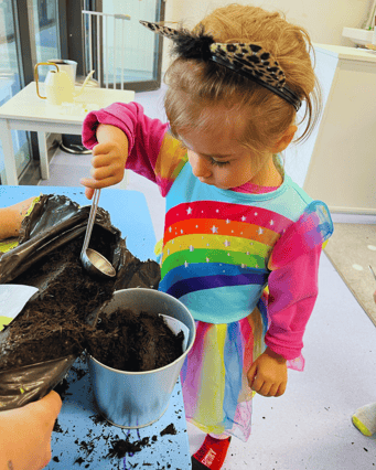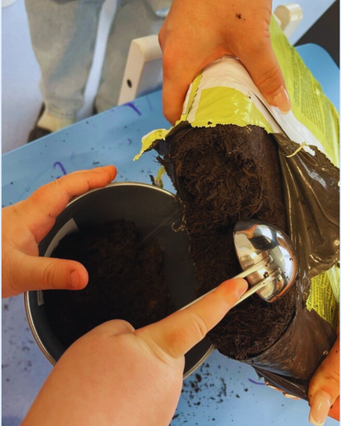Zuerst haben wir die Erde in kleine Töpfchen gefüllt. 🪴🌍 Das fühlte sich weich und krümelig an – richtig cool! 😄