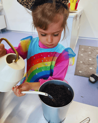 Also haben wir unsere Pflänzchen ganz vorsichtig gegossen 🌱🚿 – aber nicht zu viel, damit die Samen nicht davonschwimmen. 🌊🙈