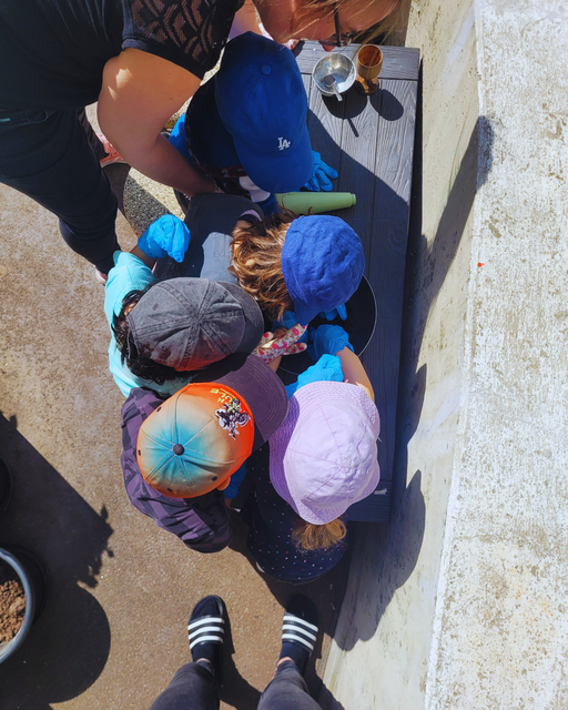 Nachdem wir das Hochbeet wieder mit Erde befüllt hatten, durften wir die Pflanzen in die Erde setzen 🌱, sie ganz fest andrücken ✋ und zum Schluss den Pflanzen genügend Wasser 💧 geben, damit sie gut wachsen können 🌿.