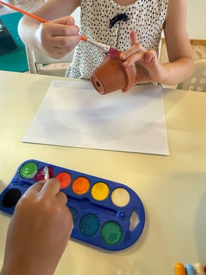 Als die Töpfe fertig bemalt waren, haben wir sie vorsichtig mit Erde gefüllt. Die war ganz weich und krümelig – manche von uns hatten danach sogar ein bisschen Erde auf der Nase! Dann kamen die