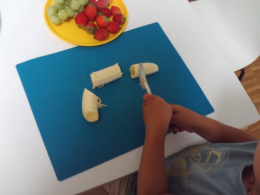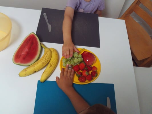 Sommerzeit ist Früchtezeit, wir haben heute in der Kita geholfen einen Fruchtsalat zum Zvieri vorzubereiten. Dabei durften wir die Früchte wählen die uns besonders gut schmecken. Wir haben uns für Bananen, Trauben, Wassermelone, Erdbeeren und Äpfel entschieden. Zuerst haben wir die Hände gewaschen und sind die Früchte die wir für den Fruchtsalat brauchten in der Küche waschen gegangen. Jeder von uns hat sich ein Schneidbrett und ein Kindermesser genommen und wir haben die Früchte auf dem Schneidbrett mit dem Messer zerkleinert und in eine grosse Schüssel gegeben. Erdbeeren, Bananen und Wassermelone waren einfach zu zerkleinert. Der Apfel hingegen war schwerer zu zerkleinern. Jedoch haben wir es geschafft in dem wir uns gegenseitig unterstützt haben den harten Apfel zu zerkleinern. Danach waren wir richtig Stolz auf uns. Zum Ende als alle Früchte zerkleinert waren und ein bunter Fruchtsalat entstand, haben wir noch eine Zitrone gepresst und den Saft der Zitrone über die Früchte gegeben. Wir durften dann den Fruchtsalat mit einem Salatbesteck durchmischen. Im Anschluss haben wir jedem Kind eine Schale sowie ein Löffel auf seinem Platz gestellt und seine Trinkfalsche. Wir durften den Salat selber in die Schüssel schöpfen und nach unserem Zvierilied « Das Zvieri-Glöckli» haben wir den Fruchtsalat gemeinsam gegessen. Es hat uns viel Freude bereitet das Zvieri vorzubereiten und uns hat der Fruchtsalat sehr gut geschmeckt, es blieb nichts übrig .