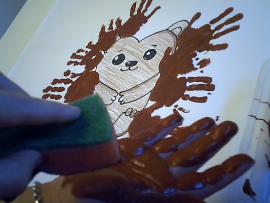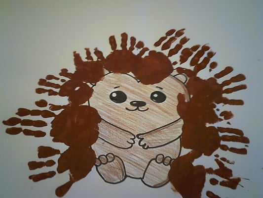Dann konnte es losgehen. Chiara tupfte uns die braune Farbe auf die Hand. Danach drückten wir unsere Hand auf ein Blatt auf dem ein Igelkörper war. Stück für Stück wuchs unser Großer Igel. Am