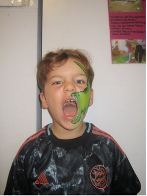 Neben ihr saß ein Junge, das unbedingt ein Dino sein wollte. Er sah aus, als käme er direkt aus einem wildem Dinosaurier Park. Andere Kinder wollten lieber etwas Lustiges: ein Clownsgesicht mit