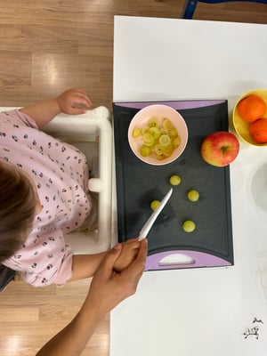 Manchmal helfen wir auch in der Küche. Dann schneiden wir Gemüse, rühren Teig oder waschen Obst. Wenn das Essen fertig ist, sind wir richtig stolz – und finden, dass es doppelt so gut schmeckt,