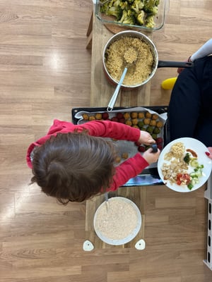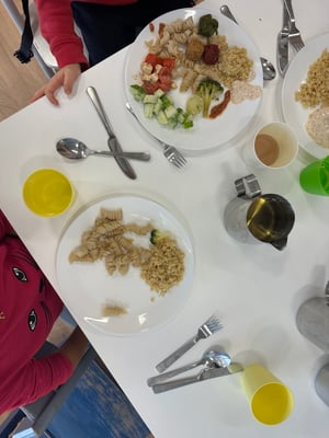 Wir finden es toll, dass wir in der Kita bei den Mahlzeiten so viel selbst machen dürfen. So lernen wir, Verantwortung zu übernehmen, Rücksicht zu nehmen – und merken jeden Tag: Gemeinsames Essen