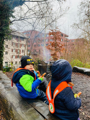 Sitzend auf den grossen Baumstämmen durften wir dann im Kreis ein Wienerli, Brot und Gemüse essen und dabei warmen Punsch schlürfen.