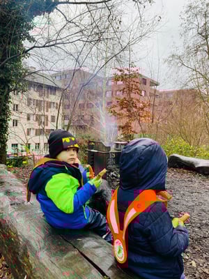 In warmer und regenfester Kleidung trafen wir uns vor der Kita und durften draussen warten bis alle eingetroffen sind. Dann gingen wir los, in das nahe gelegenem Wald.