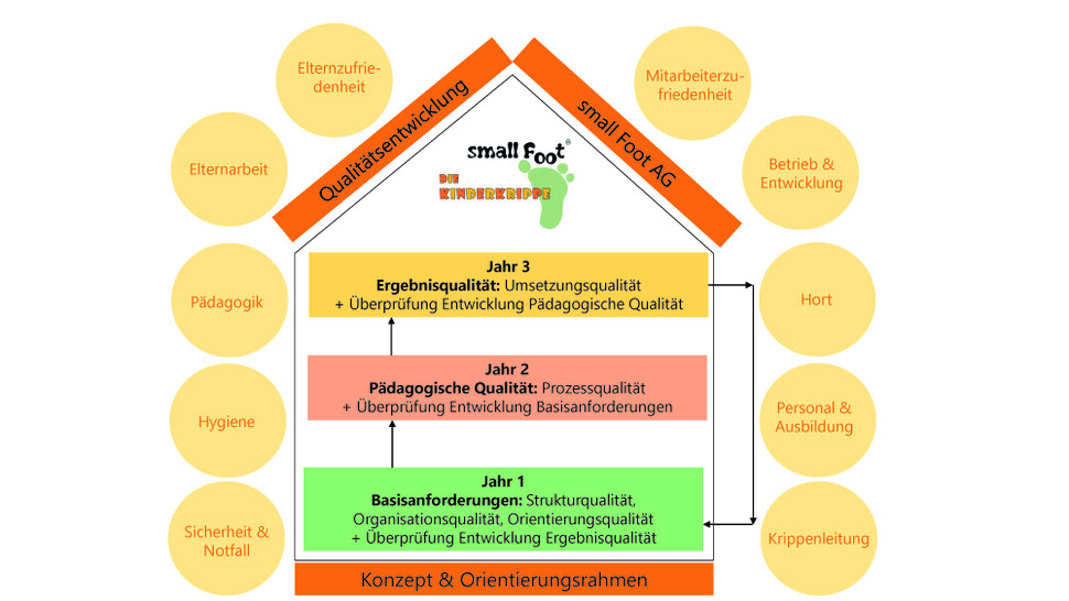 small Foot AG hat sich bewusst gegen ein externes Qualitätslabel entschieden und ein eigenes Qualitätsentwicklungsinstrument entwickelt. Es besteht die Überzeugung, dass eine interne Fremdevaluation die Verbindlichkeit von Qualitätsentwicklungsmassnahmen erhöht. Da die überprüfenden Personen die KiTas, das Konzept und die Personen gut kennen, besteht bereits eine professionelle Beziehung und es kann dadurch besser auf standortspezifische Besonderheiten eingegangen werden. Auch der Entwicklungsprozess kann besser begleitet und überprüft werden, da eine stetige Zusammenarbeit bzw. ein stetiger Austausch besteht.